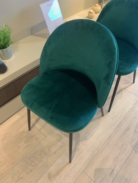 Sedie in velluto Verde Bosco e gambe metallo verniciato nero. Seduta accogliente.